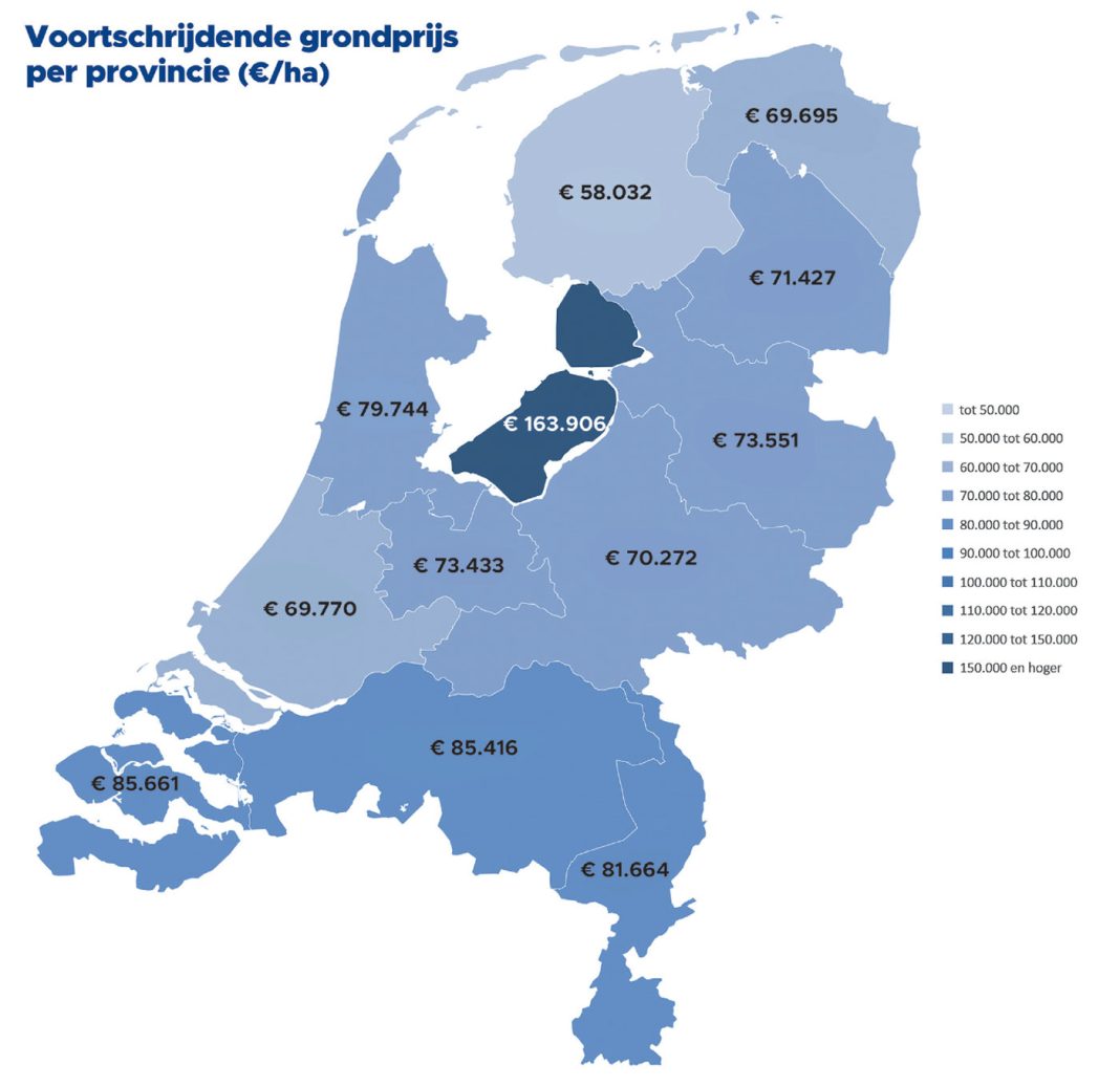 Veruit de hoogste prijzen in het Noorden worden betaald in de Noordoostpolder. ‘Daar begint de handel vanaf € 160.000 voor een hectare akkerbouwgrond’, zegt Sybesma. In Noord-Groningen wordt voor goede akkerbouwgrond momenteel € 130.000 tot € 140.000 per hectare betaald. ‘Dat is meer dan de prijs die voor goede akkerbouwgrond in Noordwest-Friesland. Die varieert tussen de € 90.000 en € 110.000’, constateert Turkstra. Dat er in Noord-Groningen meer wordt betaald, heeft volgens hem deels ook te maken met de uitbreiding van de Eemshaven.
