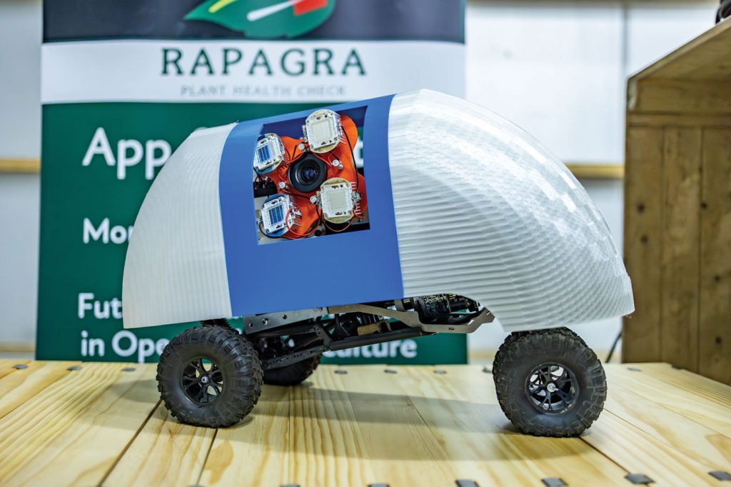 Een flink uit de kluiten gewassen ‘muis zonder staart’. De Cam-Bot waakt in het veld over de plantgezondheid.